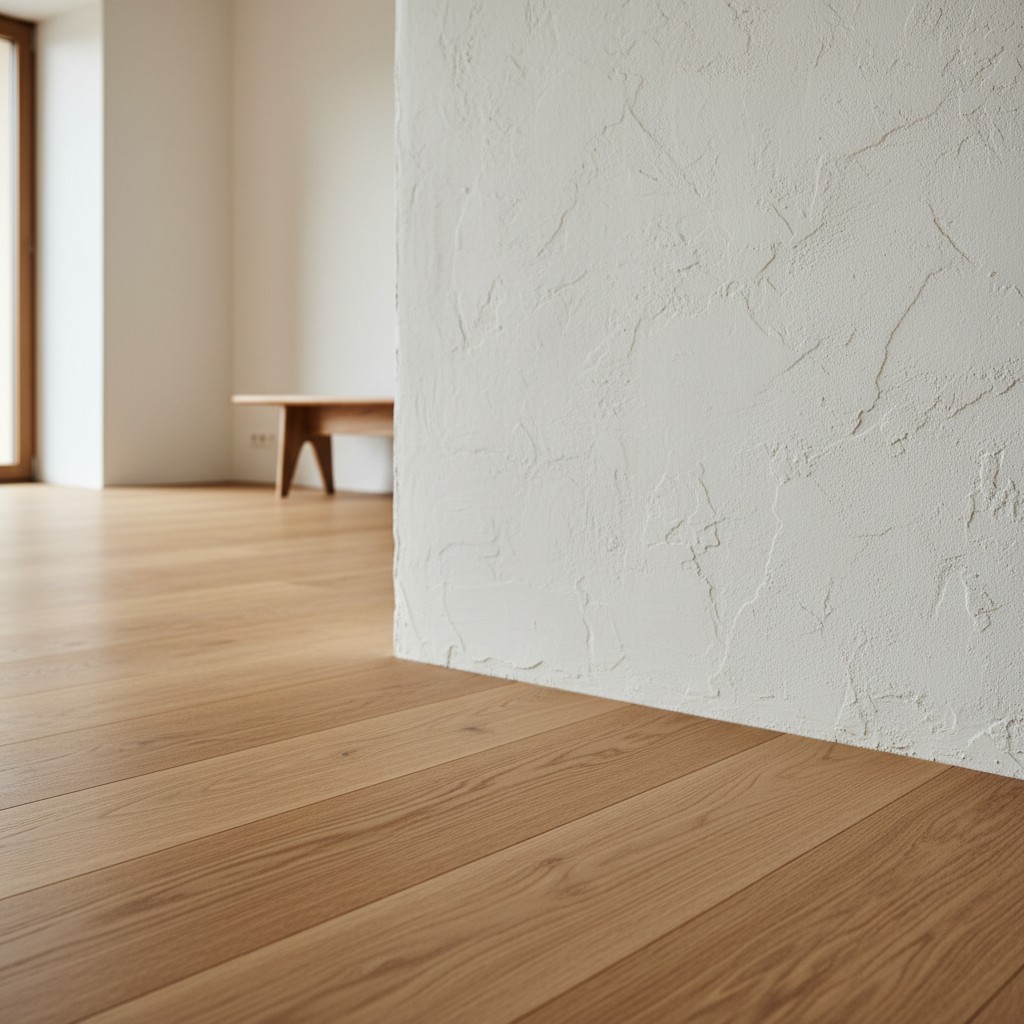丁寧に加工された無垢材のフローリングと、手仕事感が残る漆喰の塗り壁のクローズアップ。自然な木目と壁のテクスチャーがはっきりとわかる、温かみのある質感のコントラスト。