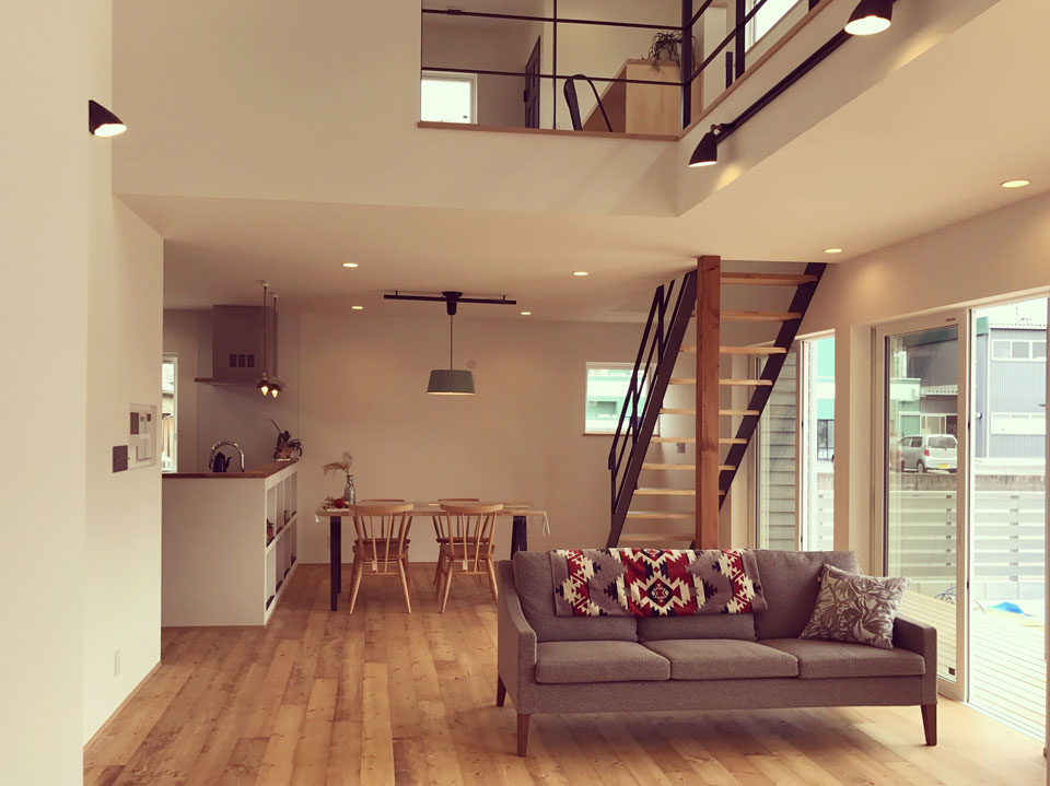 リビング上部の吹抜け空間が開放性を生み出しています。また、建物中央に吹抜けを計画することでどこからでも家族の存在を感じることができます。この建物はインテリアの先生に入っていただいているので細部まで手が加えられています。