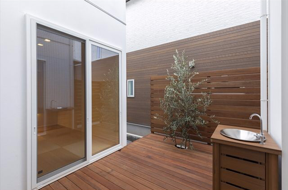 中庭形式のデッキテラスがある家