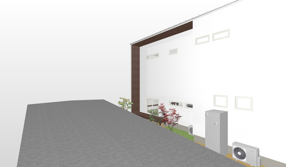 北側のファサードです。配置的には裏側になりますが2面通路に挟まれたモデルハウスとして裏側にならないデザインとしています。