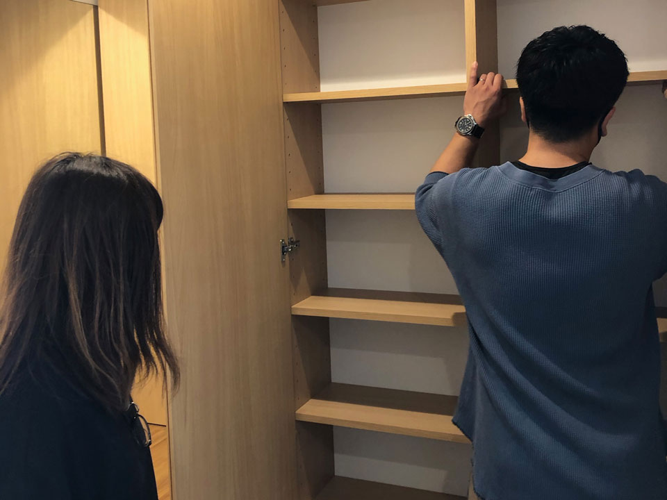 最終段階の確認として、各部の仕上げや建具、造作収納の可動棚など細部の精度を確認しました。