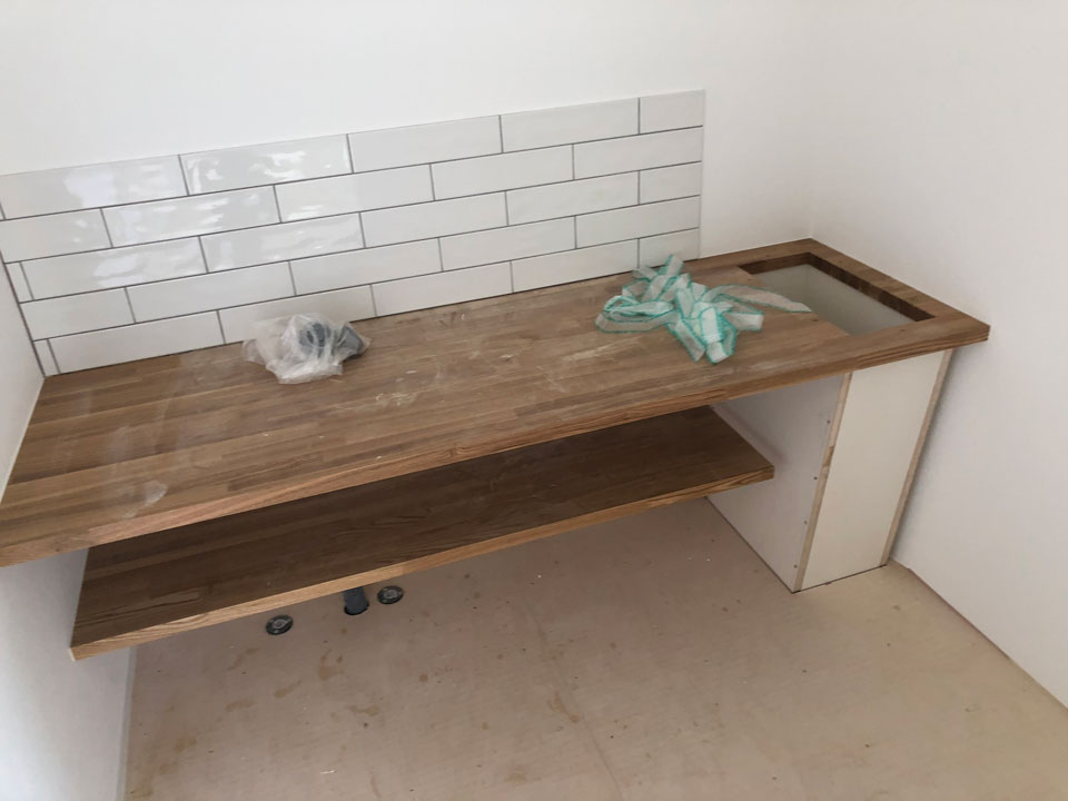 造作の洗面カウンターとランドリーシュート。クロスとタイル貼りが完了し、床仕上げを残すのみ。